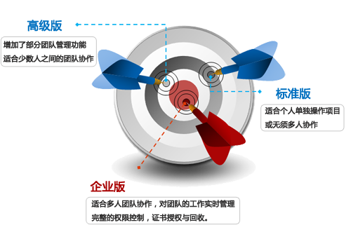 适合多人团队协作,对团队的工作实时管理,完整的权限控制,证书授权与回收。
